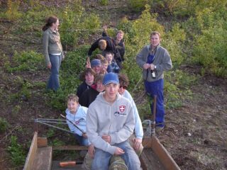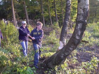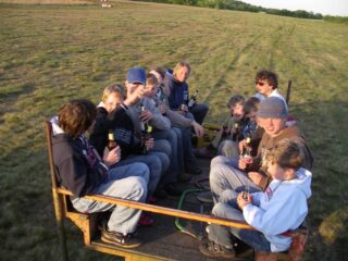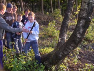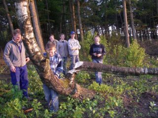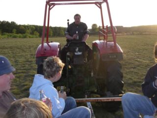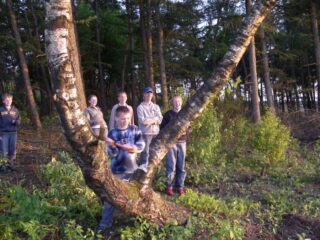 Der Trecker wurde angespannt und man versammelte sich mit Getränken auf dem Anhänger. Nach einer langen Zeit des Suchens konnte endlich eine passende Birke ausgemacht werden. Stilecht wurde die Birke mit einem Beil gefällt. Die Motorsäge mußte diesmal zu Hause bleiben.