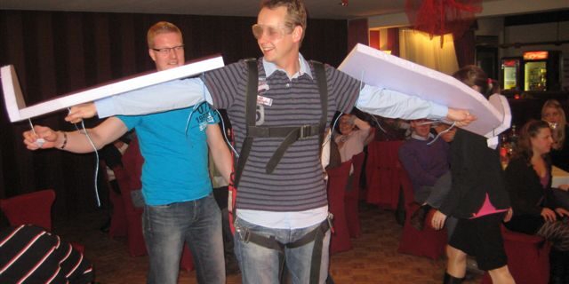Um die Stimmung weiter anzuheizen, schickten die Surwolder Frank mit einem kleinen Spiel auf die Thermiksuche. Fein ausgestattet mit einem soliden Fahrwerk in Form von Inlinern, einem von Raimund und Reiner entwickelten und gebautes Tragwerk und einem Rettungsfallschim ging es auf den Rundkurs rund um eine stationäre Thermikquelle. So würden wir uns Segelflieger auch in Zukunft die Kennzeichnung von Thermikquellen vorstellen. Unter der Moderation von Andreas gelang es Frank immer besser den Bart zu zentrieren und unter dem tosenden Beifall der Zuschauer wurde die Tagesaufgabe soverän erfüllt. Dieses neue Livetracking System wird mit Sicherheit noch auf vielen Streckenflugbewerben in 2012 zu finden sein.
