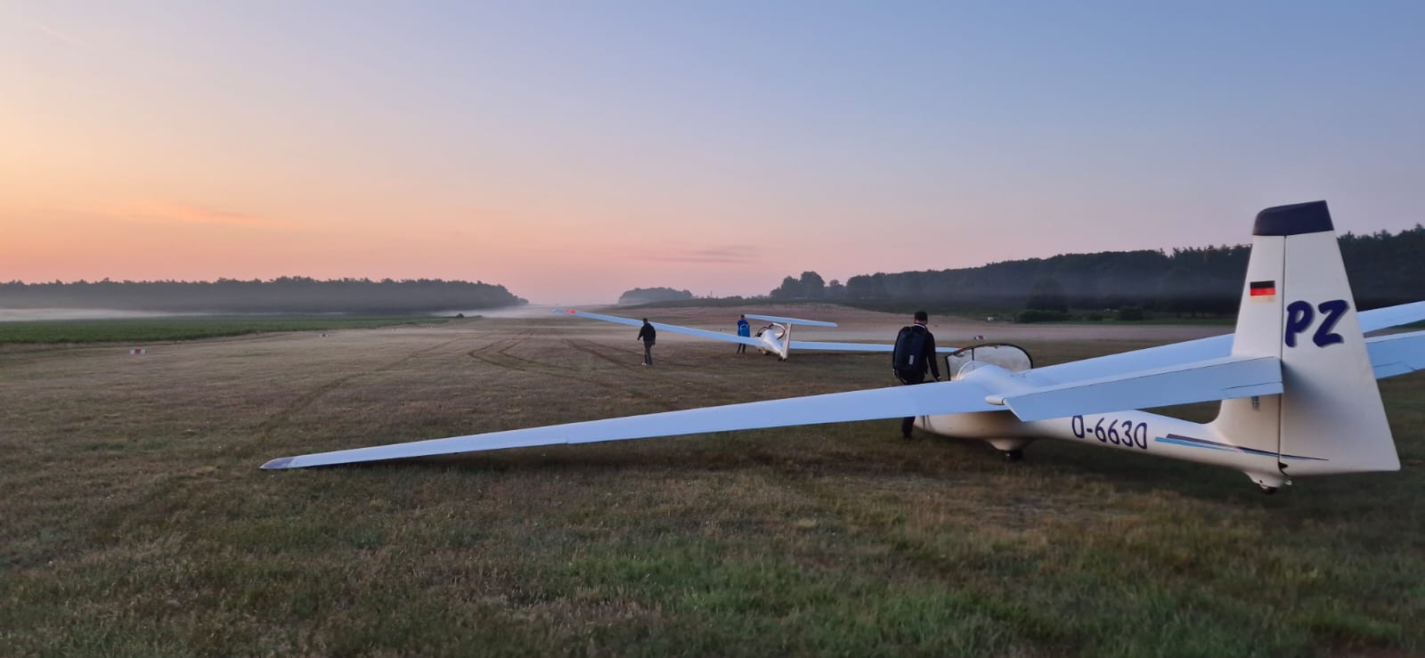 Es dämmert bereits leicht über dem Surwolder Steinberg und nur ein schwacher Wind weht: Ideale Bedingungen für den 1. Alleinflug!